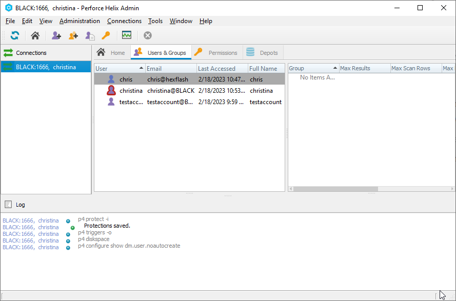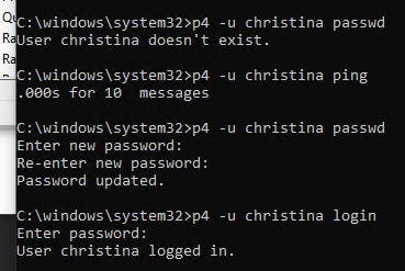 p4 -u christina pingYou can see there is no ‘christina’ user, until I perform an action claiming to be user ‘christina’. As soon as I do, the user is created. After that, I’m able to set a password, and then log in.