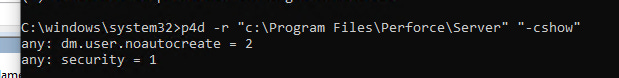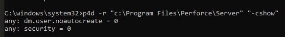 Usually when you use perforce CLI commands, you’re using the client (p4.exe) to send commands to the server remotely. However, you can’t log in with the client, because of all that security you put on it. So we’re going to use the server executable itself (p4d.exe) to rewrite its own configuration file.